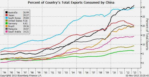 Ποσοστό του συνόλου των εξαγωγών κάθε χώρας που καταναλώνεται από την Κίνα